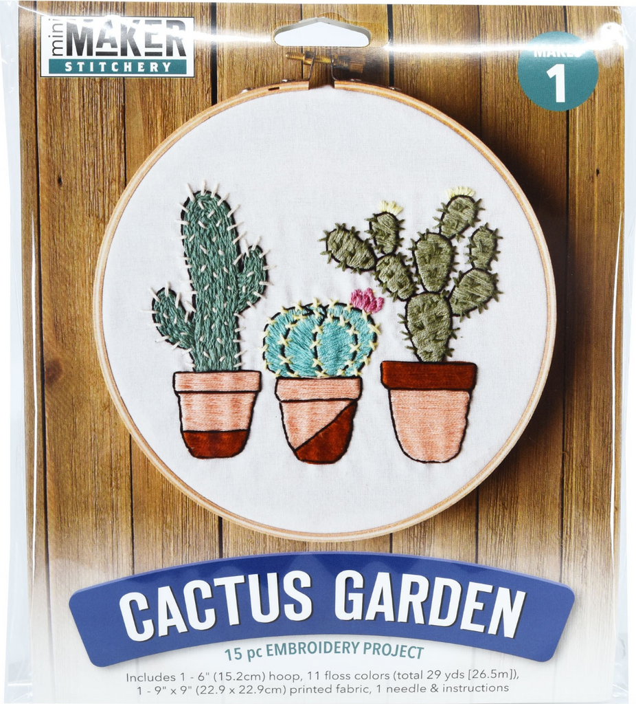 Kit contain everything you need to create your project unless otherwise stated. Make In A Weekend Embroidery 6" Cactus Garden- Design features cacti in flower pots. Kit includes: 1 wooden embroidery hoop, 11 embroidery floss colors totaling 29 yards, 1 printed 9"x 9" fabric piece, 1 needle, and instructions. Use the embroidery hoop to keep the fabric taught and then to display your project. Makes 1 design. Colors and contents may vary.